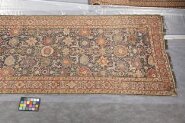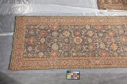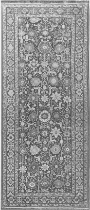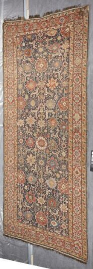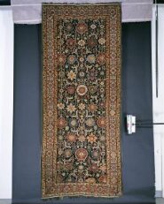 Hand knotted woollen pile, on woollen warp and cotton weft; symmetrical knot; 75 knots per sq. in (1,160 per sq. dm)